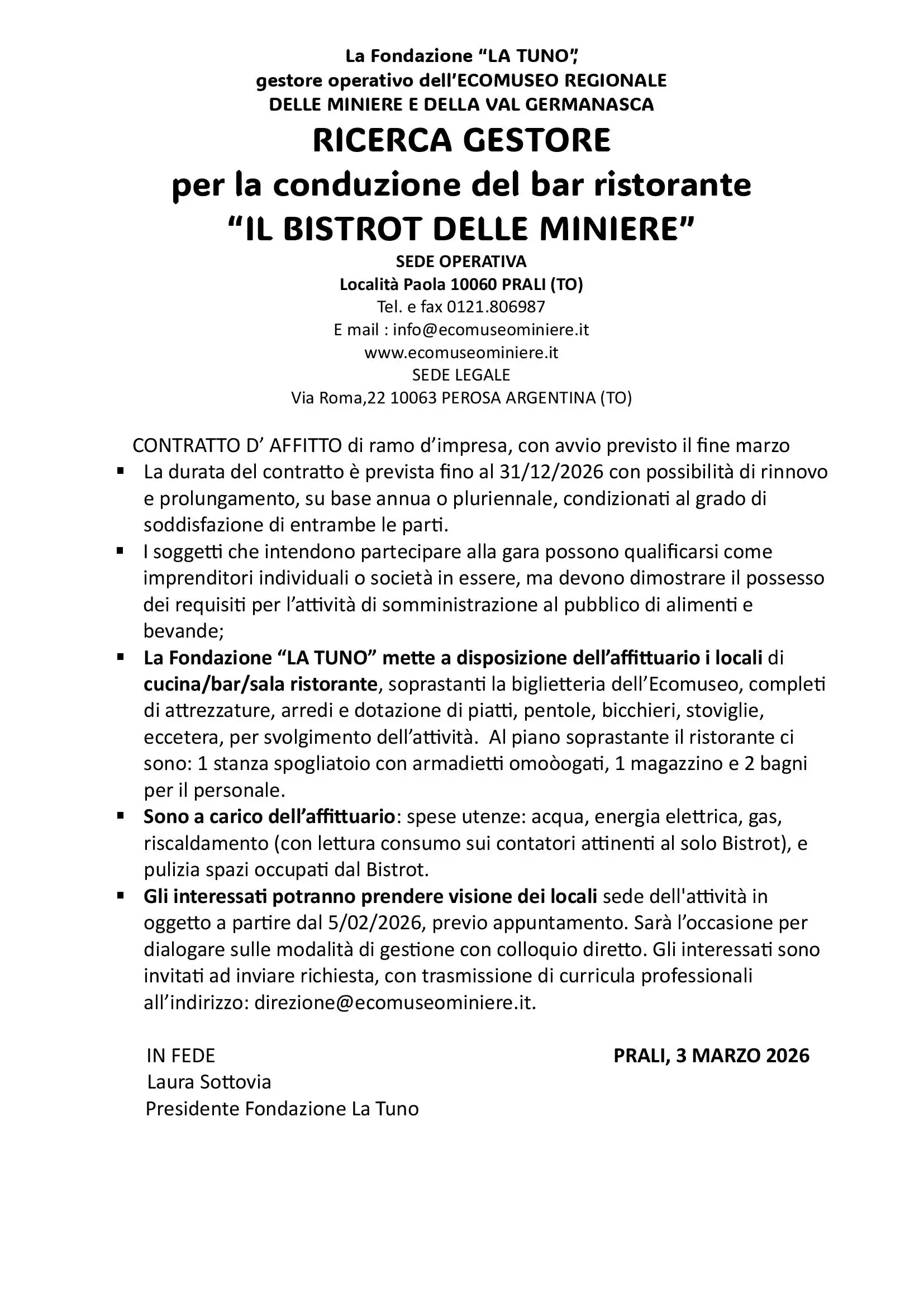 La Fondazione La Tuno, gestore operativo dell'Ecomuseo Regionale delle Miniere e della Val Germanasca, rende noto l'avvio della procedura per la selezione di un gestore per la conduzione del bar ristorante "Il Bistrot delle Miniere", situato in località Paola - 10060 Prali (TO).